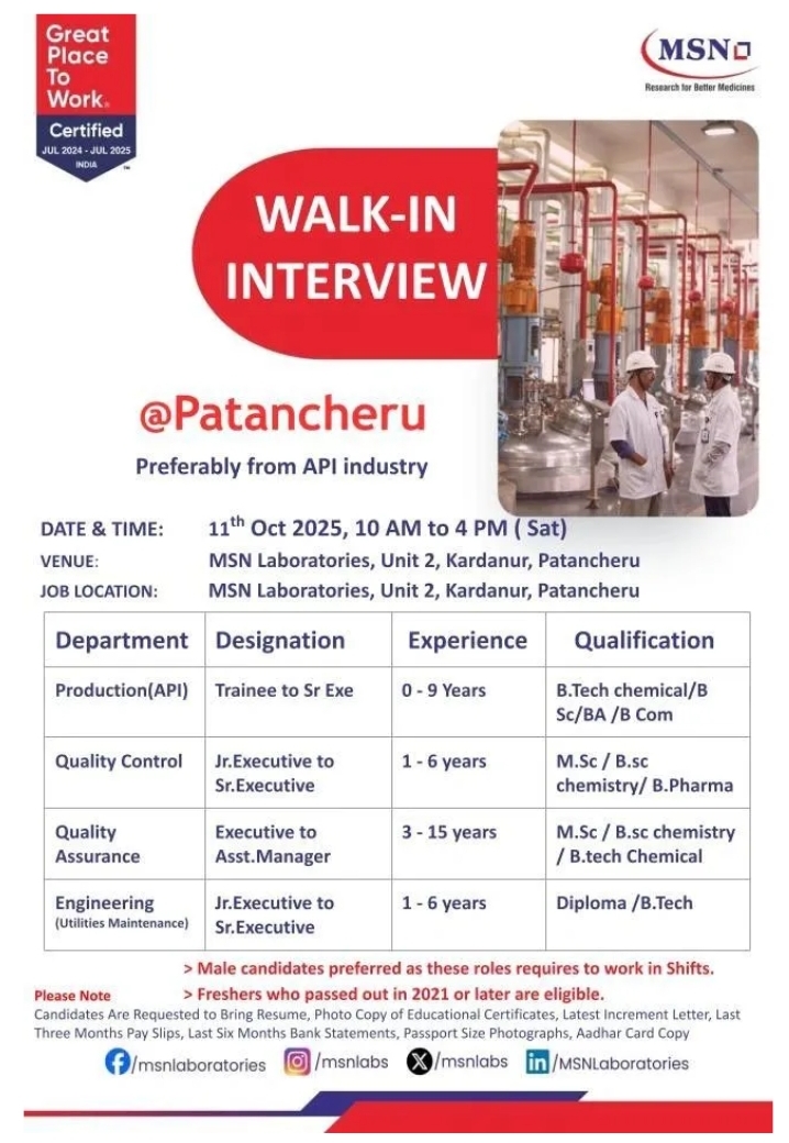 In conclusion, MSN Laboratories Pharma jobs in Patancheru are an ideal opportunity for candidates looking for a progressive career in the pharmaceutical industry. Don’t miss this excellent walk-in interview — take the next step toward building your future with one of India’s most respected pharma companies.