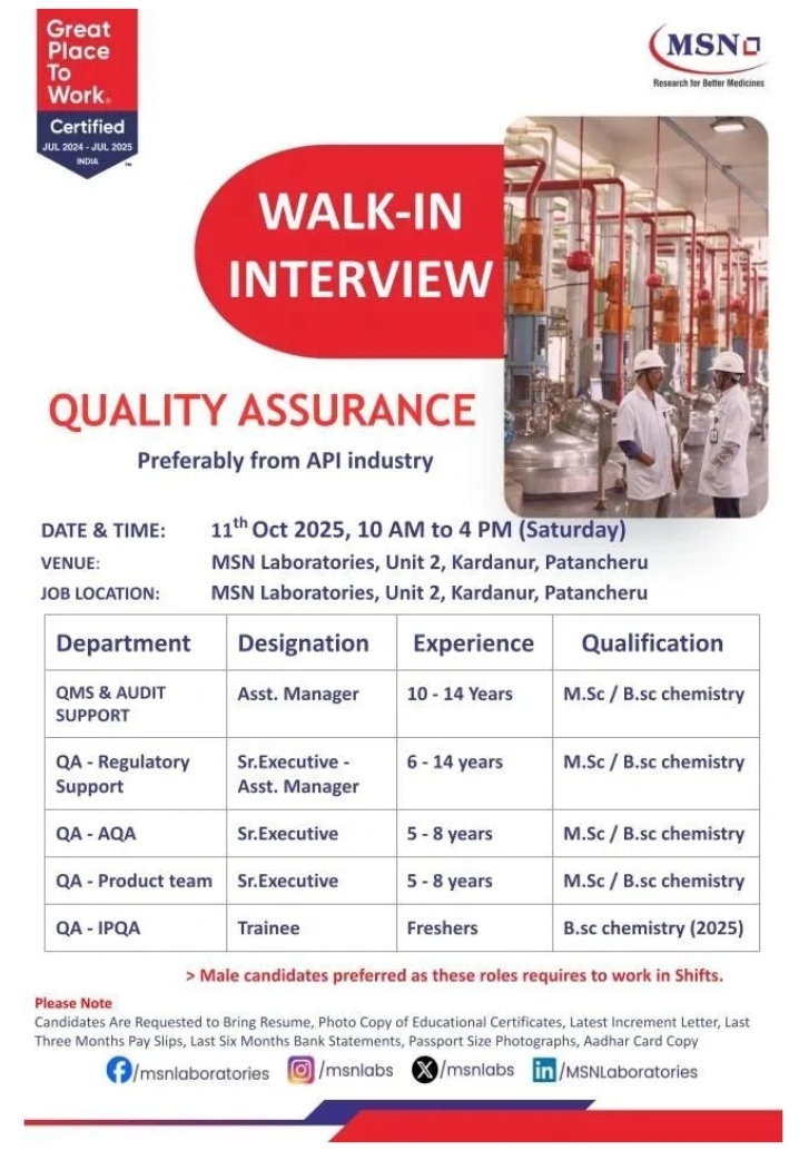 MSN Laboratories Pharma jobs in Patancheru offer excellent career opportunities for talented individuals looking to grow in one of India’s leading pharmaceutical organizations. The company is conducting walk-in interviews for multiple departments including Production, QA, and Packing. This is an incredible chance for pharma professionals to join a reputed firm known for its quality, innovation, and employee-friendly environment. Interested candidates should take advantage of this walk-in interview to explore rewarding positions and build a successful long-term career in the pharmaceutical industry.